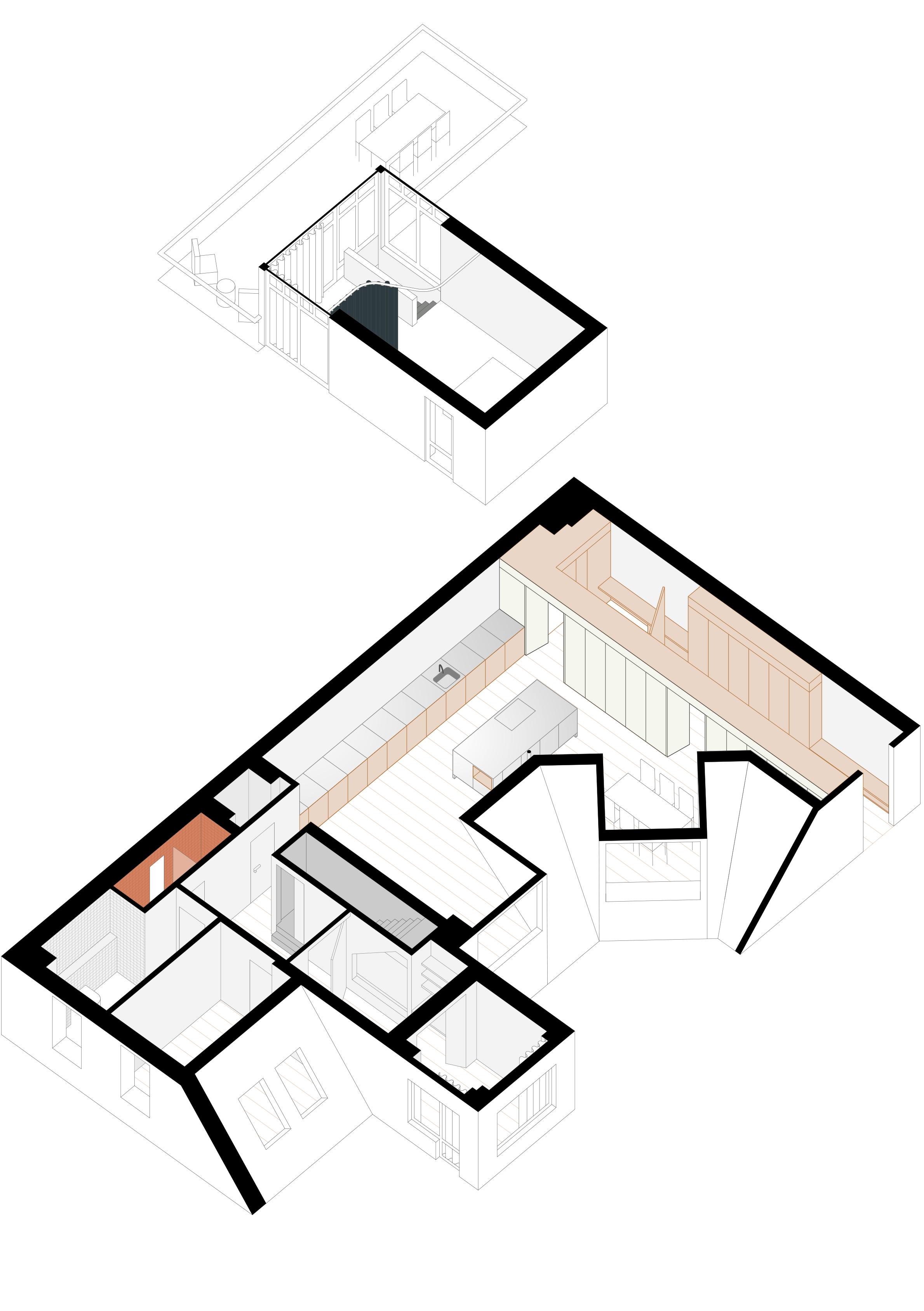 The design focused on calming the fragmented layout and creating spatial clarity. Small-scale partitions were removed, and a space-dividing built-in introduced an entryway, workspace, and part of the kitchen, separating them from the main living area. This open living, dining, and kitchen zone now forms the heart of the apartment. The staircase to the panoramic room divides private areas with bedrooms and bathrooms, while the master bedroom on the upper level opens to a terrace with views across Berlin’s rooftops.
