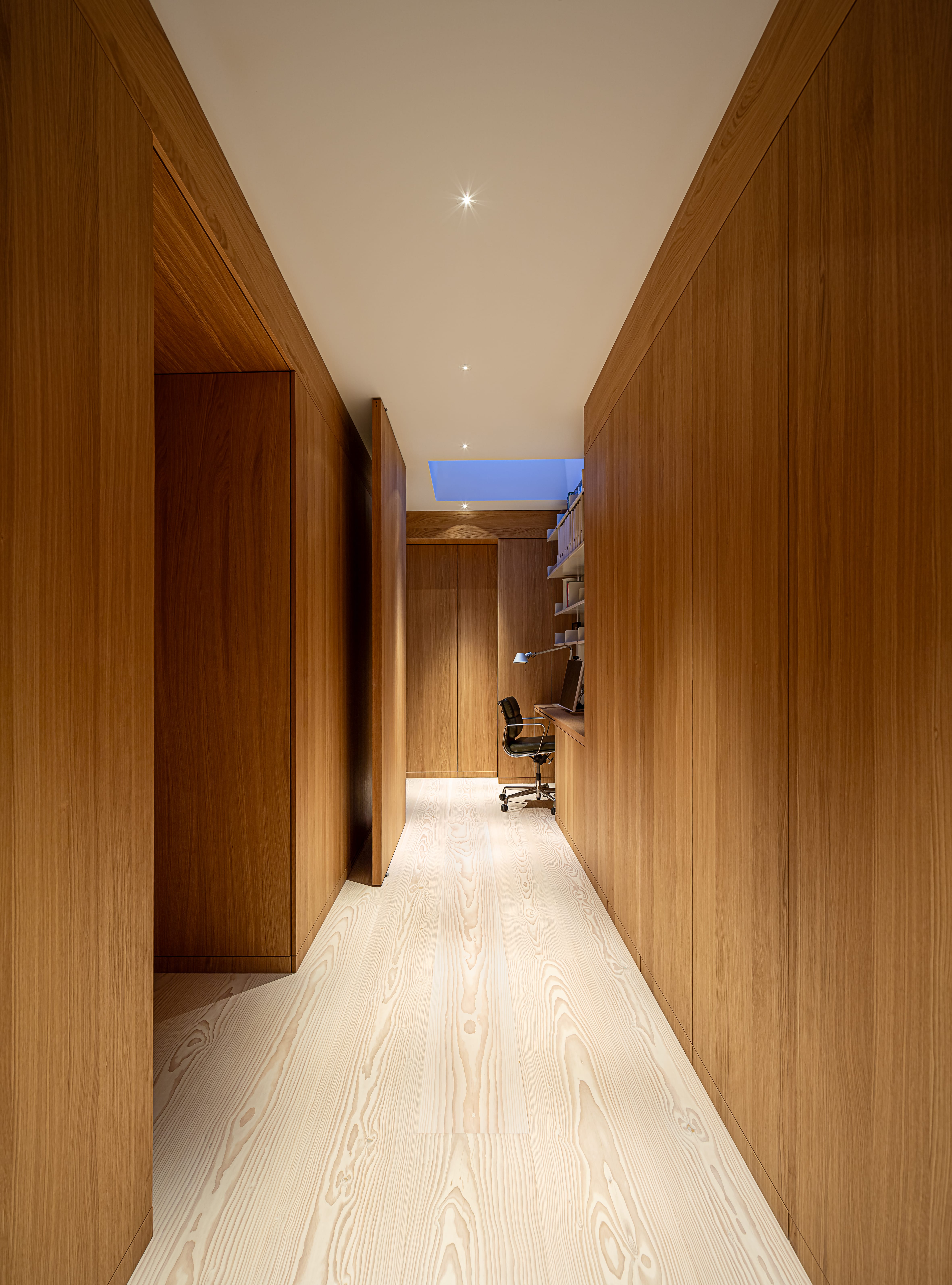 A cohesive palette of authentic materials—Douglas fir, oak, stainless steel, and clay plaster—brings purist elegance and warmth. Wide Douglas fir planks unify the redesigned rooms, while oak cladding defines the entry and workspace. The kitchen centers on a freestanding stainless steel island, with oak cabinetry extending into the living area. Sage green accents and light gray clay plaster walls add calm and texture. The children’s bathroom contrasts with a bold monochrome of red mosaic tiles.