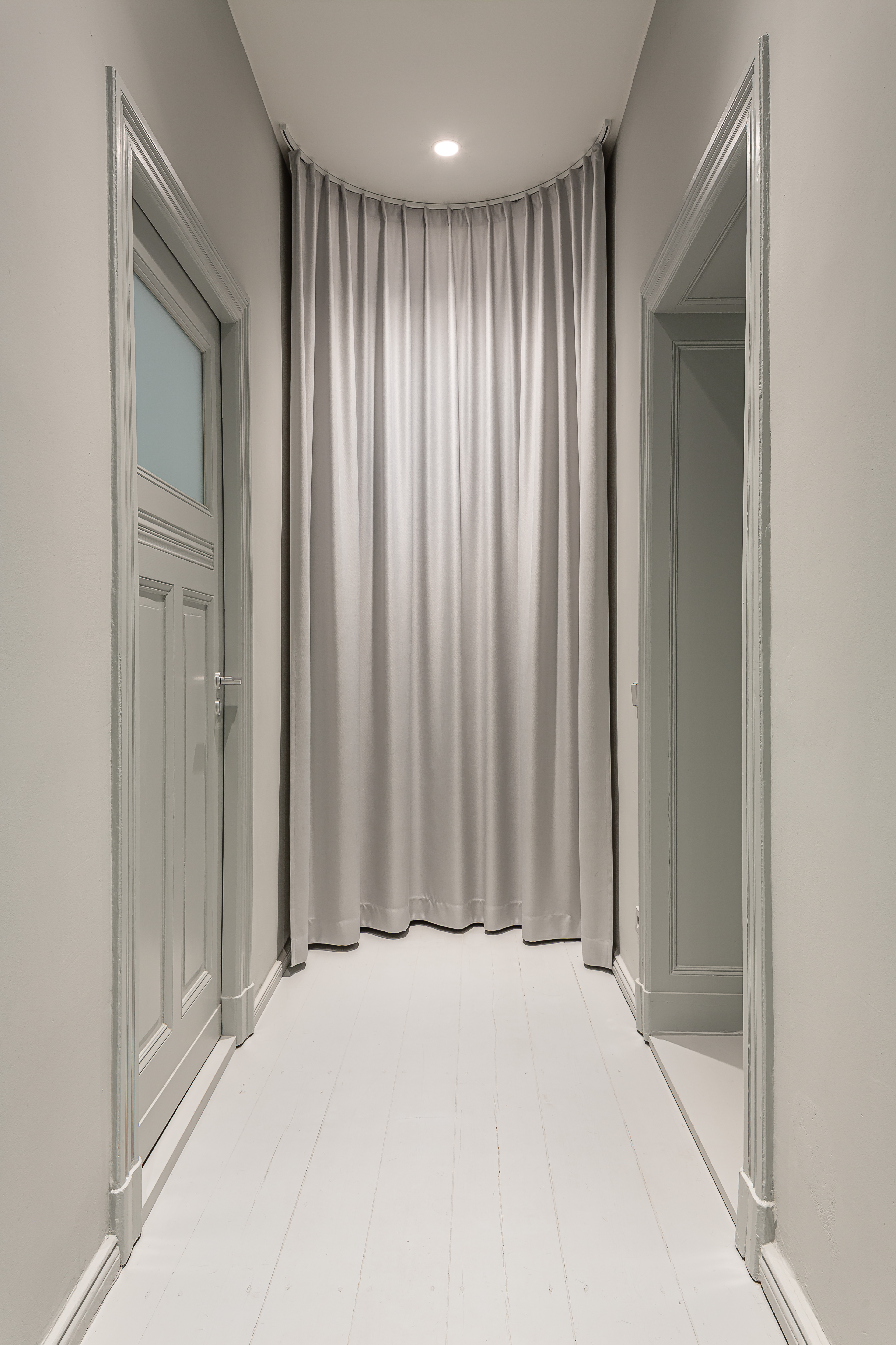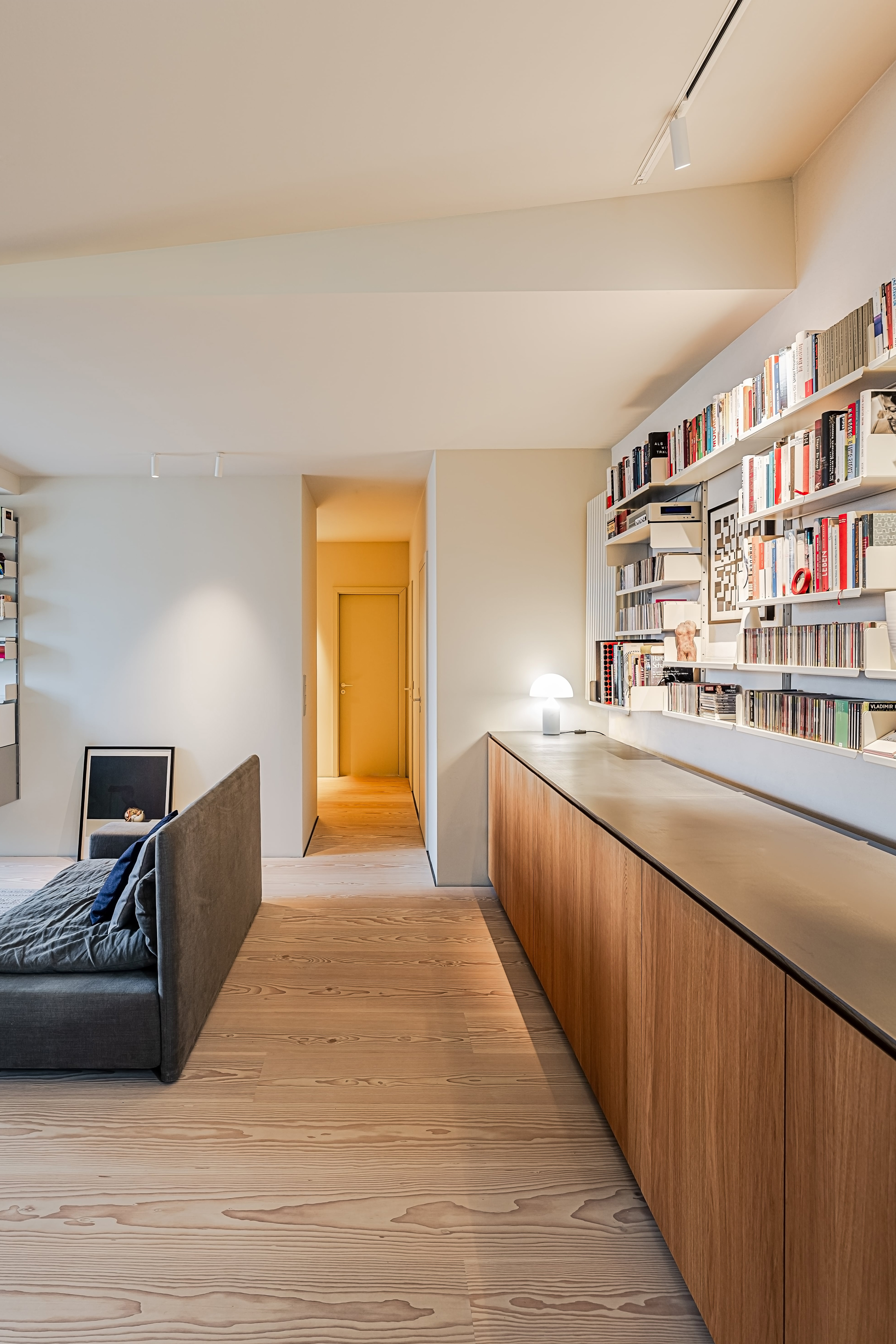 The existing historical style elements—stucco ornamentation, windows, wooden floorboards, and interior doors—were restored and integrated into the apartment’s consistently reduced design approach.