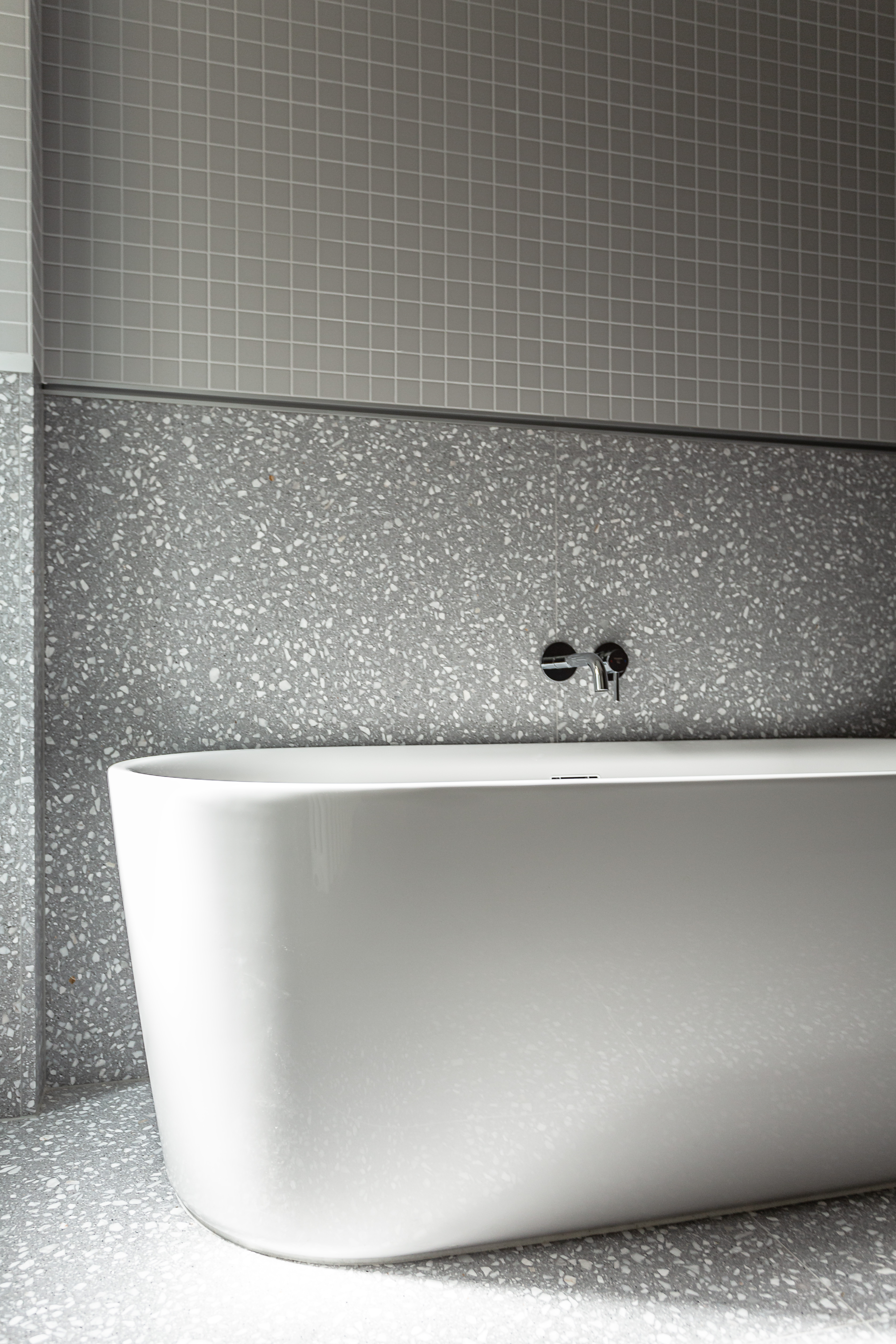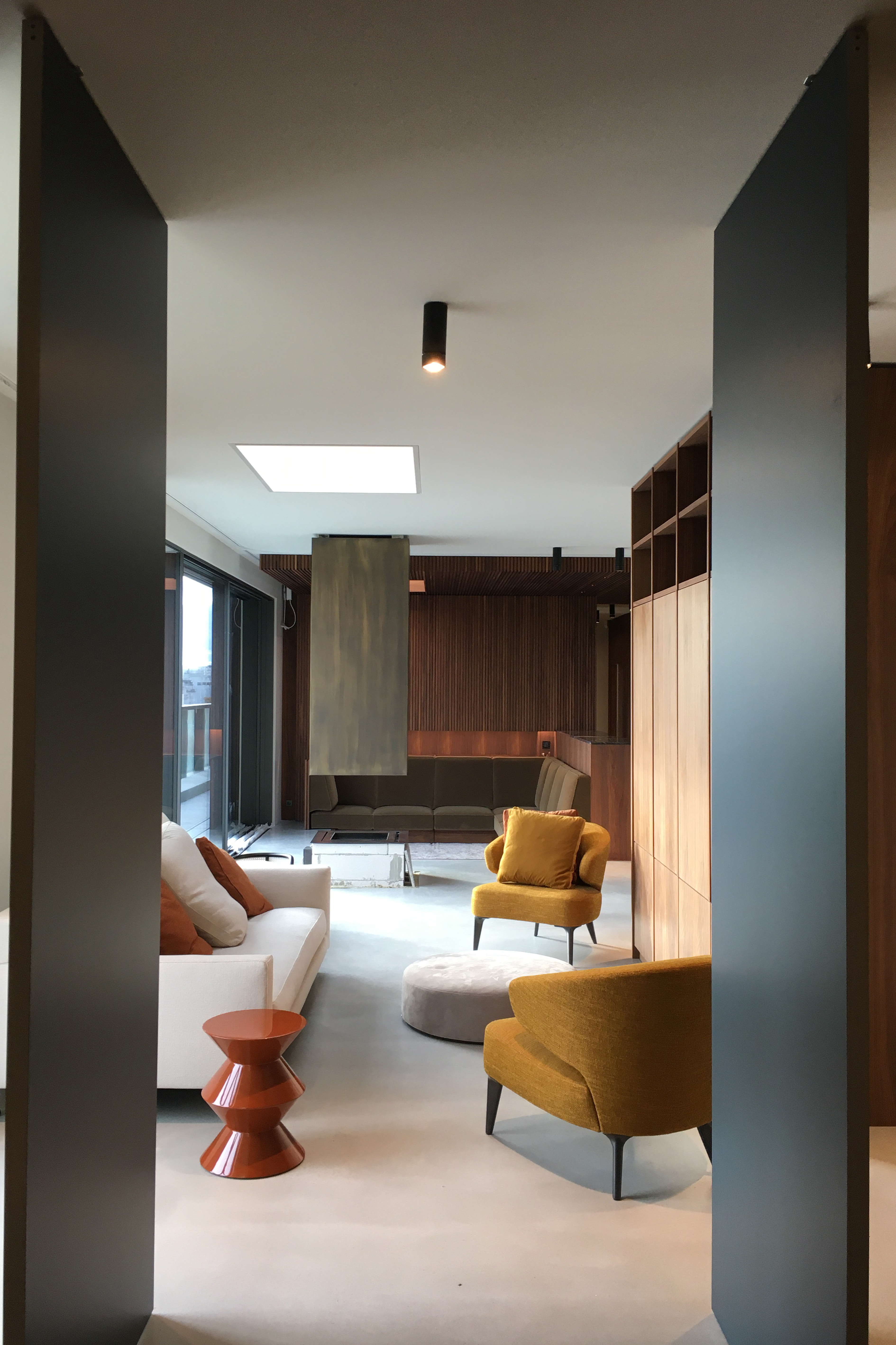 The redesign concept is based on a comprehensive homogenization of surfaces through a cohesive material and color scheme. A light gray tone for walls and floors, complemented by pastel turquoise accents, visually unifies the different surfaces. The newly implemented staircase becomes the central design and functional element of the apartment. With its spatially striking proportions, it connects the ground-floor living area with the private sleeping quarters. Its sculptural quality is highlighted by the minimalist choice of materials and a subtle color and lighting concept. Both bathrooms follow a unified surface concept with custom-made terrazzo slabs, light gray tiles, and brushed aluminum details. All built-in furniture—such as the wardrobe, kitchen, loft bed, and cabinets—is crafted from dark gray wood-based panels with an oiled finish.