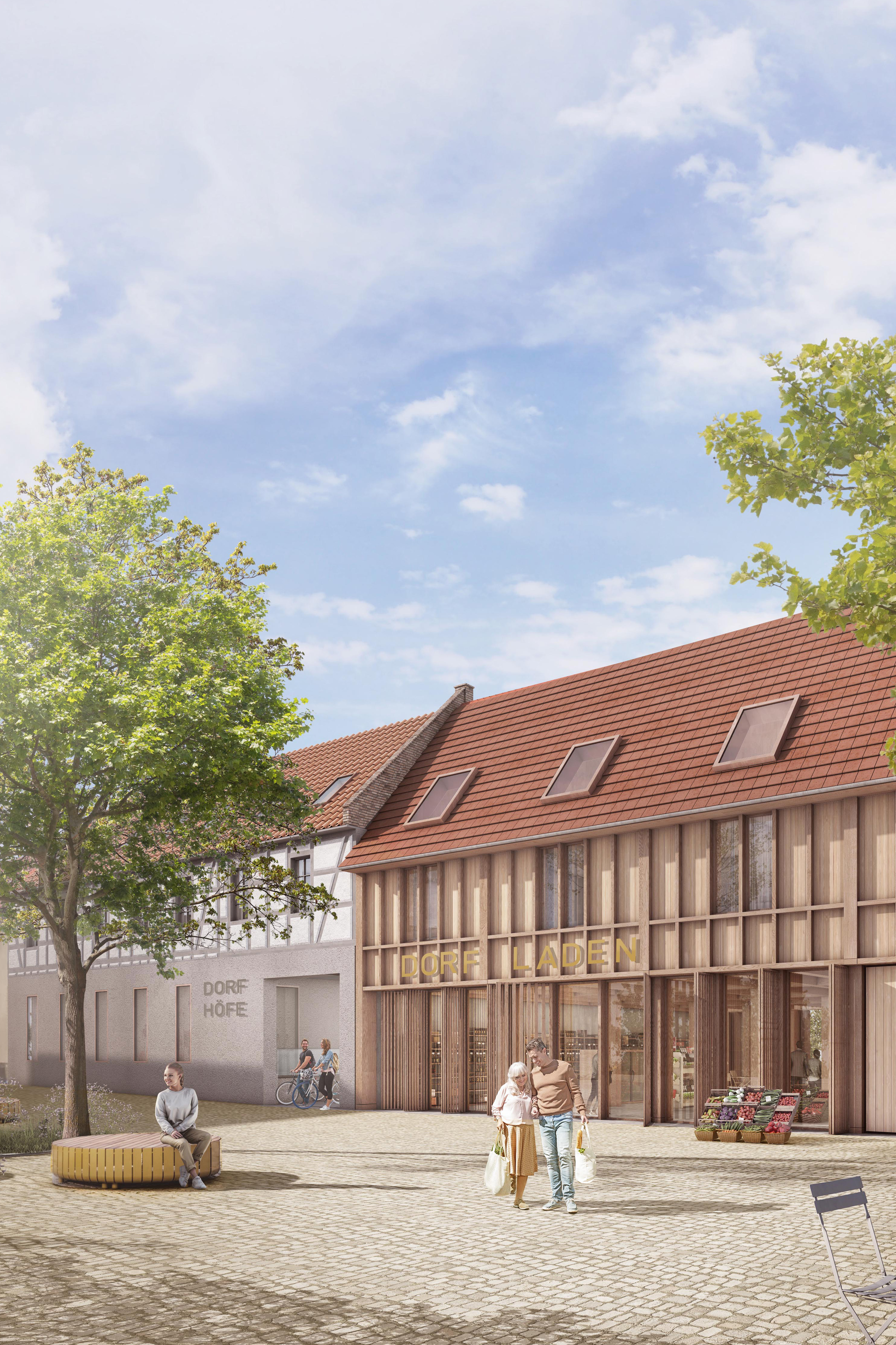 The former retail space was clearly structured: an entrance and meeting area separates the open work area, connected by a full-height pivot door. Colored curtains serve as acoustic dampeners, visual filters, and flexible room dividers all at once. Along the wide storefront windows, heating covers were created, which also serve as display spaces for architectural models—allowing passersby a glimpse into ongoing design processes. Full-height shelves keep the main room free from archives, while the former office of the market manager in the mezzanine is now used as a kitchenette and break room.