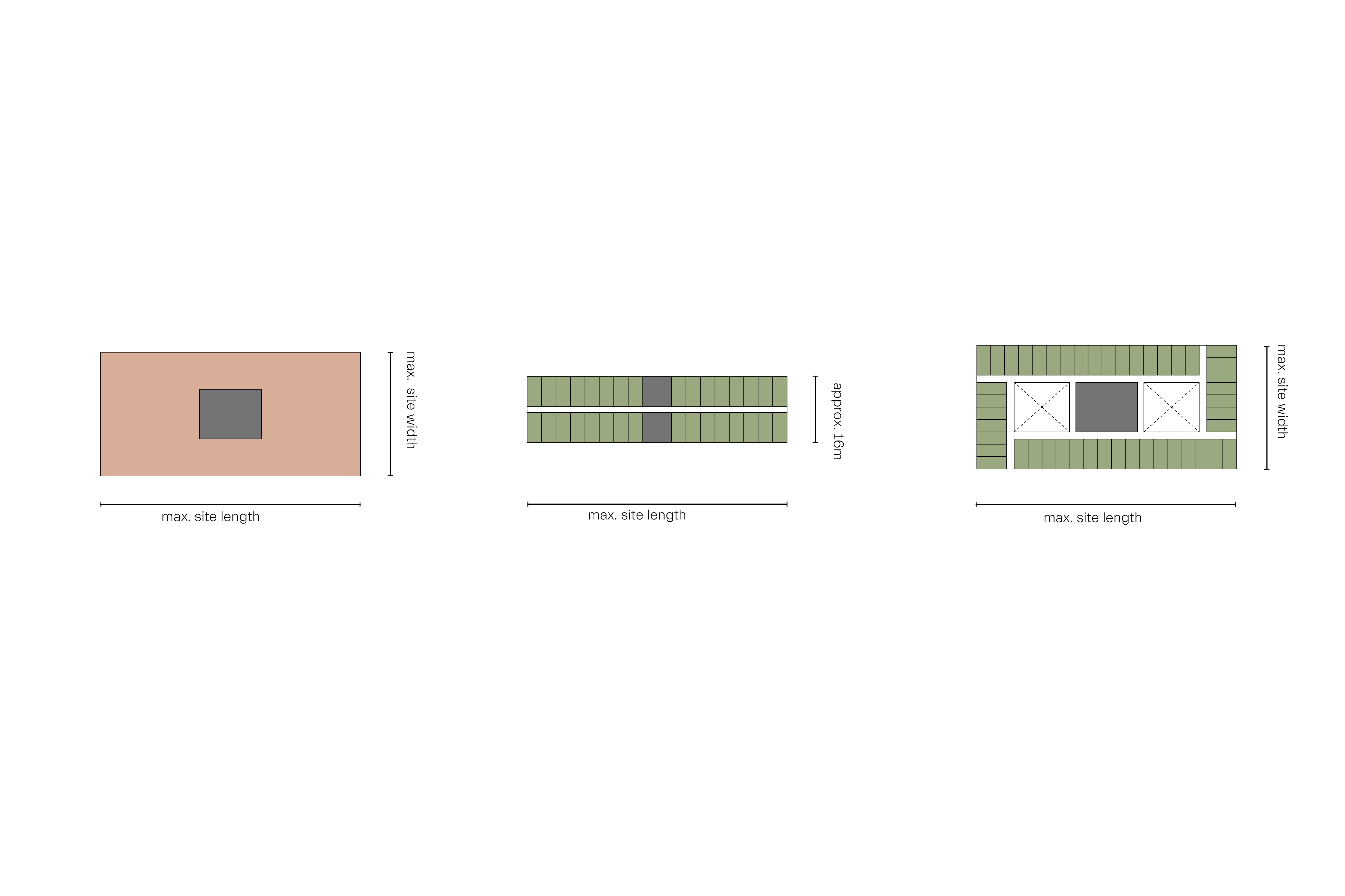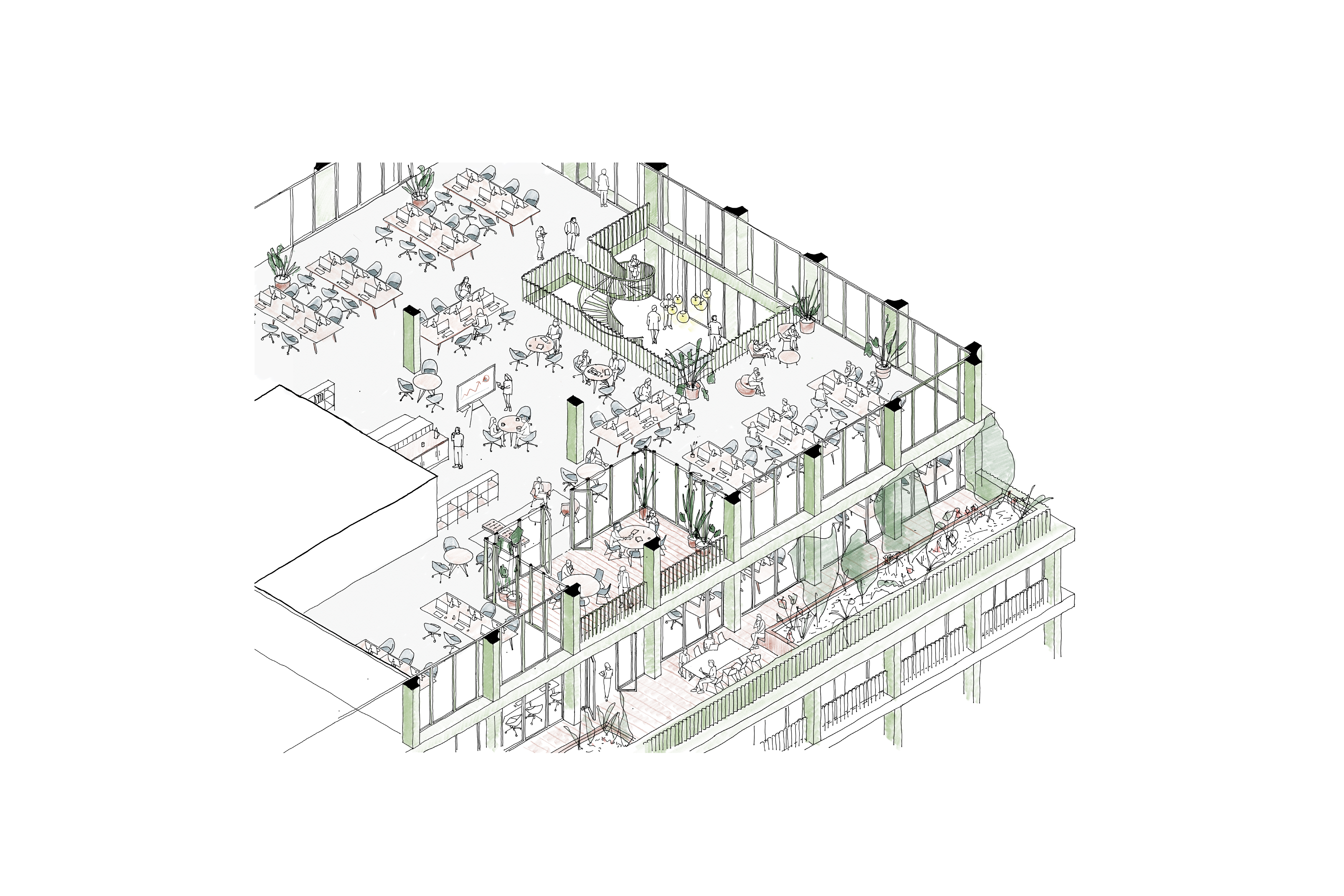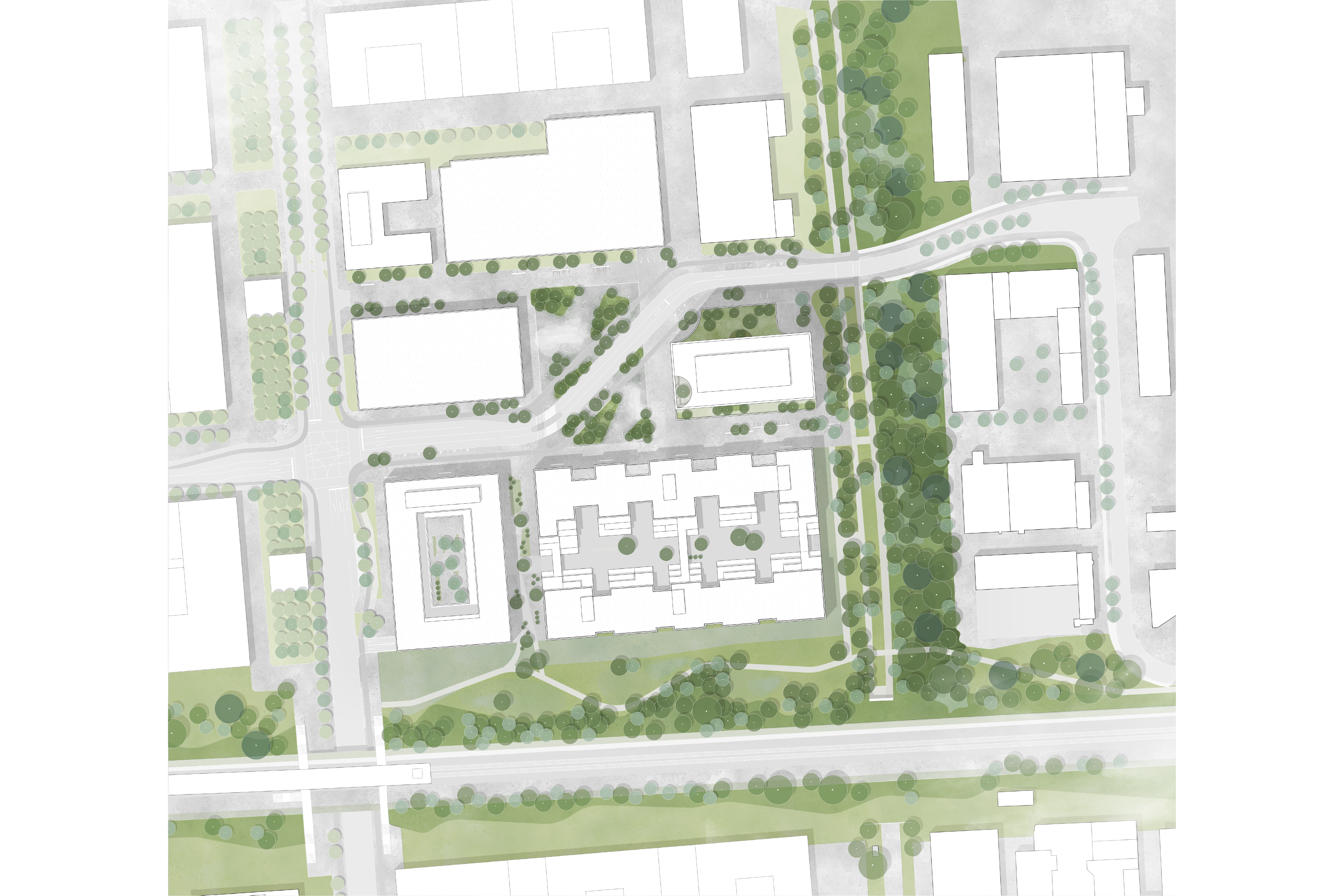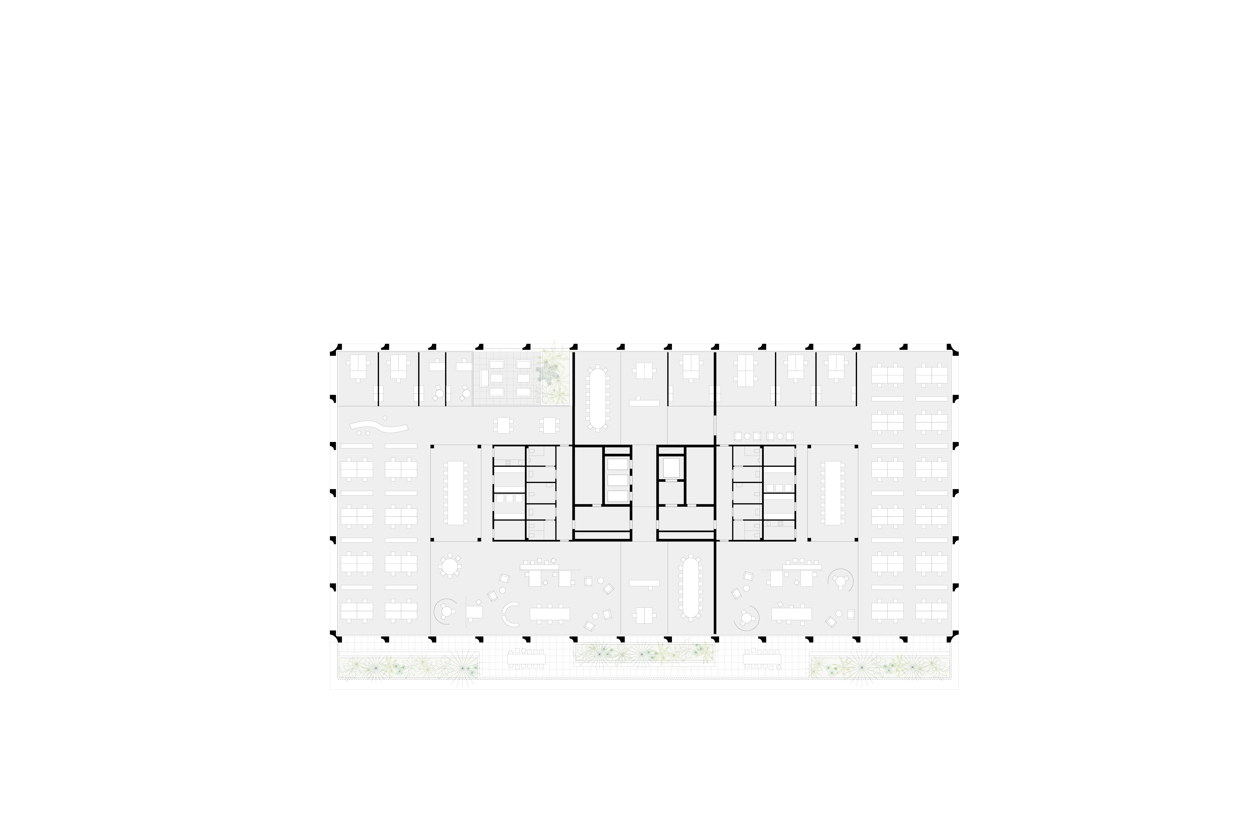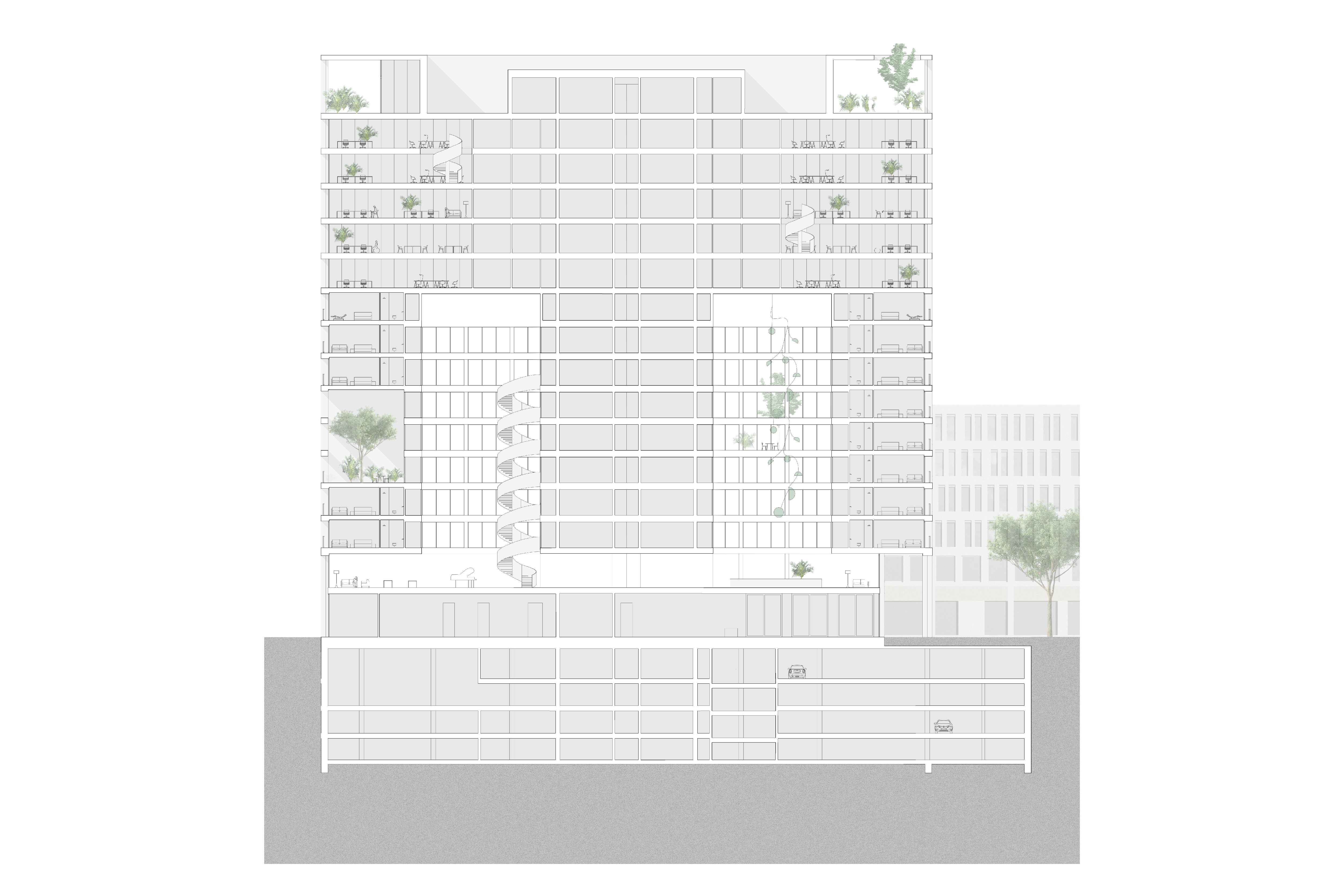 Der Entwurf hat zum Ziel, ein vielfältiges Raumerlebnis zu schaffen. Der Zugang zu den Hotelzimmern erfolgt über zwei große Atrien, die sich zwischen dem ersten und dem neunten Obergeschoss aufspannen. Die Atrien erhalten über halböffentliche, mehrgeschossige, begrünte Loggien Tageslicht. Auch in den Bürogeschossen werden über Loggien und Terrassen Grünflächen in das Gebäude integriert, die gleichzeitig für qualitativ hochwertige Innenräume sorgen.