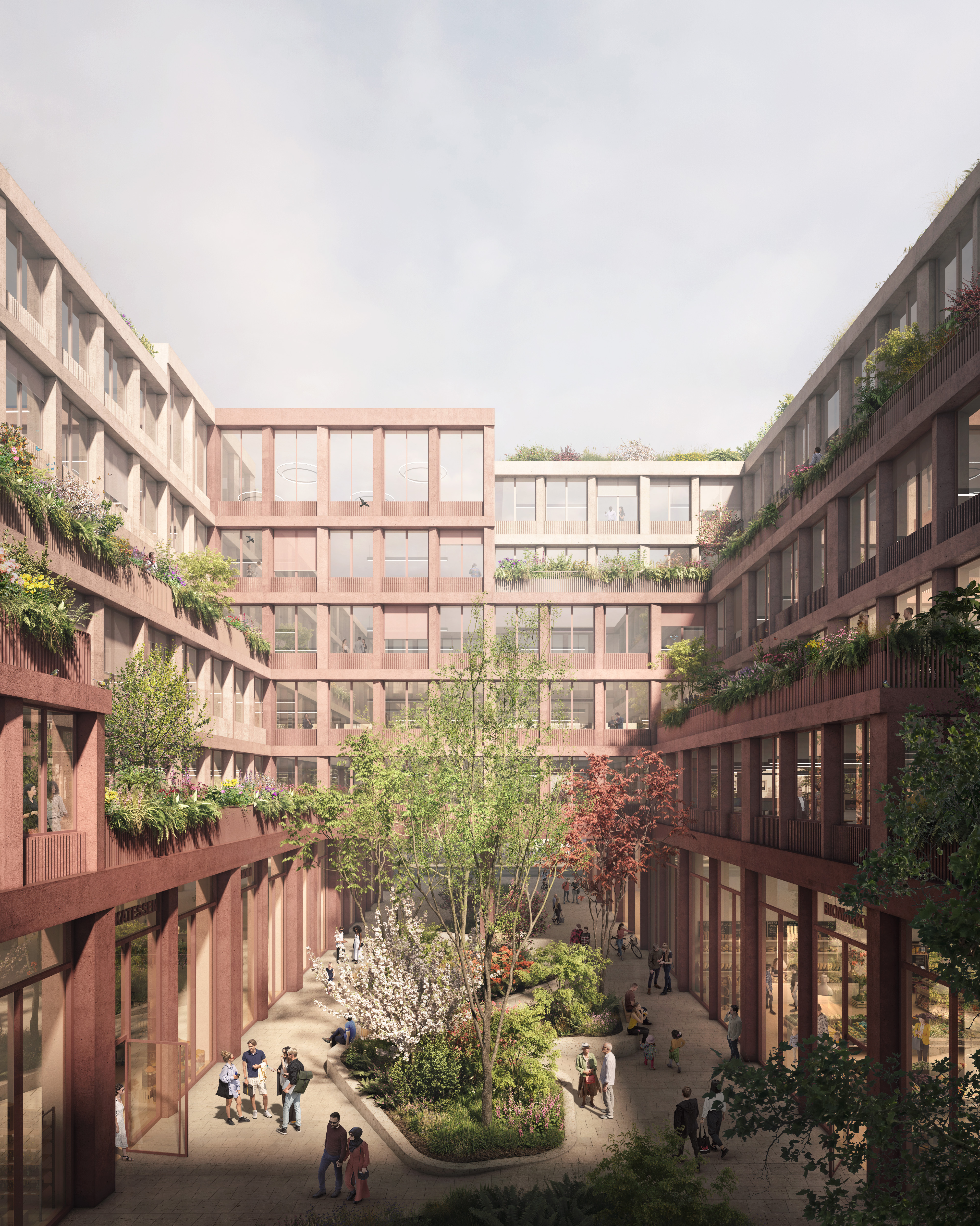 perimeter block typology and a nuanced, varied color palette—developing them